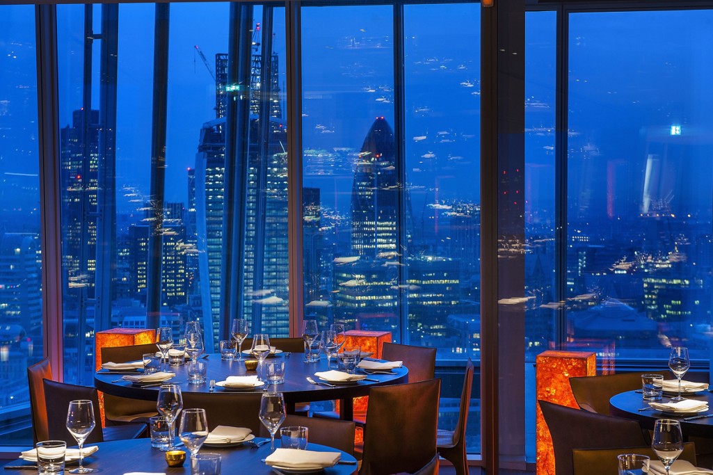 I materiali naturali, caldi e potenti contrastano con la trasparenza e la luminosità del 32° piano del grattacielo progettato da Renzo Piano nel cuore di Londra. Qui l’insieme è volutamente solido e materico. Gli elementi naturali come l’acqua, il fuoco e la terra si trasformano in forme geometriche per coniugare lo spazio astratto. La forza della pietra, la bellezza del bronzo, l’eleganza del cuoio e la durevolezza del legno d’ebano costruiscono lo spazio del locale in una dimensione senza tempo. Il Progetto si divide in 2 grandi aree distinte: il ristorante da 110 coperti e la zona Lounge Bar collegate da un lungo corridoio, simile ad una buia caverna dalla luce soffusa quasi primitiva che porta alla luminosa sala ristorante proiettata sullo skyline londinese. Due gli elementi di novità: la posizione della cucina, che diventa passaggio obbligatorio per accedere al ristorante e il Table Library per 12 persone circondato da un’elegante selezione di libri e vini.